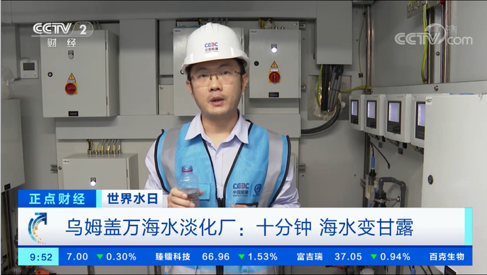 “我手上的这瓶淡化海水在10分钟前还在大海中,现在经过海水淡化厂的五道工序——除杂、过滤、渗透、矿化、消毒,已经变成了符合当地饮用标准的水。”央视记者说,“我尝了一口,一口咸味没有,同当地自来水和瓶装水的口感基本一样。”
