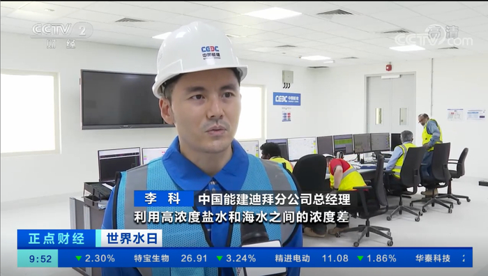 “简单来说就是利用高浓度盐水和海水之间的浓度差,收集这部分能量,然后进入我们的收集系统。这样一套系统相较于传统的海水淡化技术在电力方面大约节省了20%。”中国能建迪拜分公司总经理说。