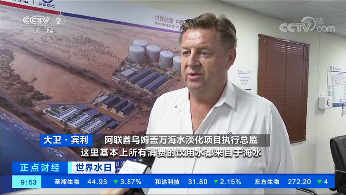 “这里基本上所有消费的饮用水都来自于海水,我们可以说99%都是。很少很少有自然淡水可以被利用,都是来自于海水淡化。我觉得海水淡化技术对这片土地来说比石油更重要。”项目执行总监说。
