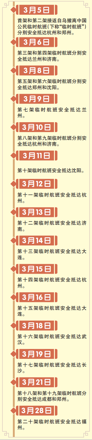 他介绍说,截至3月28日,4600多名撤离至乌周边国家的中国公民搭乘20架次中国政府安排的临时航班回到祖国。全体在乌和乌周边国家中国同胞互相帮助、共渡难关,留学生组织、华侨华人社团多次协助完成撤离工作,发扬了中华民族扶危济困的优良传统,展现出中华儿女团结互助的优良品质。