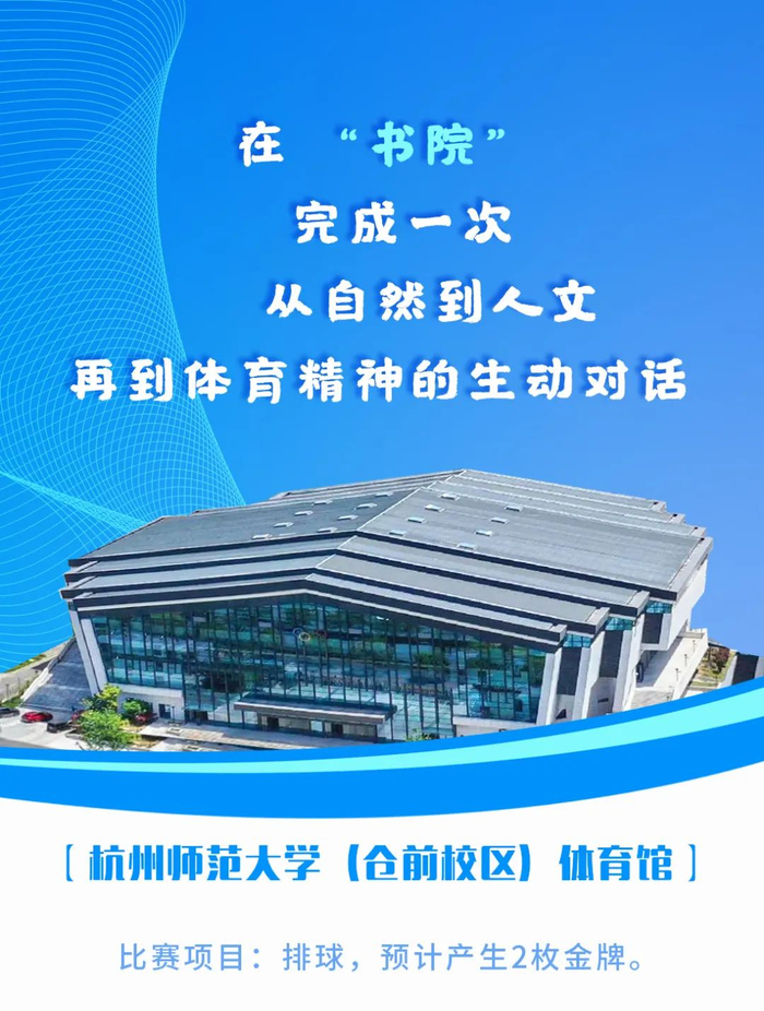 为排球项目决赛馆,是白墙黑瓦的江南民居建筑风格,延续“书院”设计理念和杭州元素。到中国女排决战赛场,现场感受永不服输的女排精神!