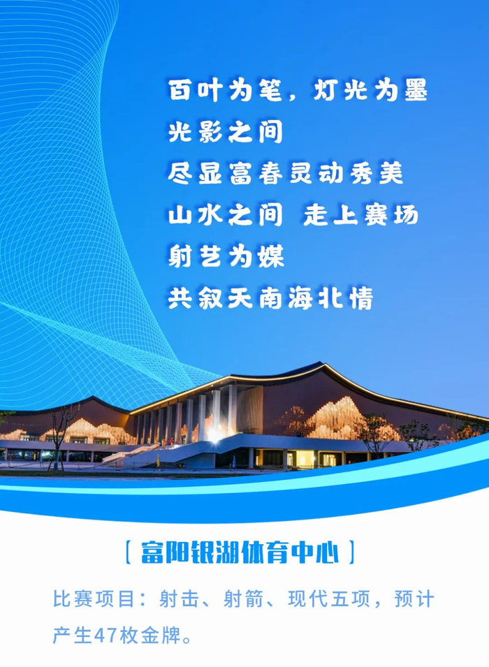 34000块百叶“绘”出“日夜山居图”、70米射程感受竞赛的“自然魅力”……场馆设计从《富春山居图》尾段山形轮廓中取材,建筑布局开合有致,融山水、重写意。白天,随着时间变化,墙面图案会呈现出不同的视觉效果;夜幕降临,射击综合馆东、南两侧幕墙上,一幅由34000片旋转百叶组成的《新富春山居图》,尽显山水意境灵动之美。