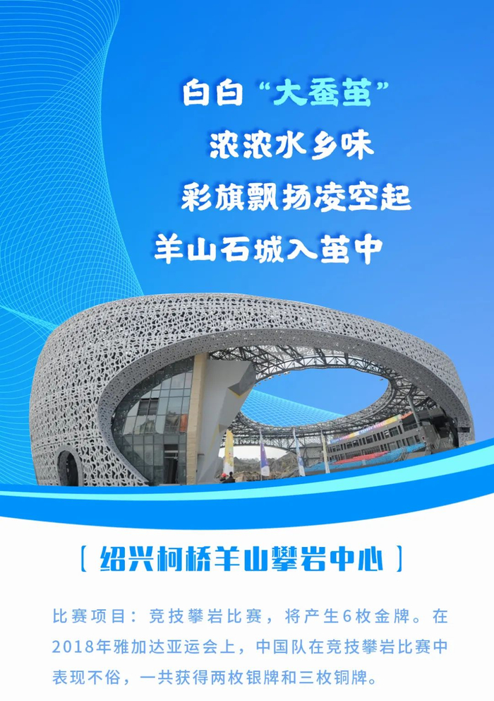 杭州奥体中心步步生莲,让人脱口而出杨万里吟莲的千古名句;大运河畔的拱墅运河体育公园体育场让人想起江南雨巷里的绸伞;绍兴的柯桥羊山攀岩中心用一个白白的“大蚕茧”诉说浓浓水乡味;温州的龙舟运动中心龙楼拔地起,舟塔冲天立……