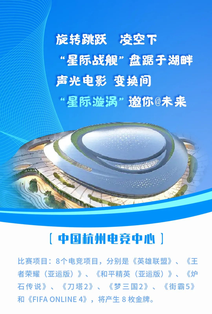 大莲花——体育场:将承办杭州亚运会开、闭幕式和田径项目比赛,以及杭州亚残运会开、闭幕式。其造型取意于杭州丝绸纹理与纺织体系,建筑体态源于钱塘江水的动态,犹如一朵美丽的莲花绽放于钱塘江畔,是继国家体育场鸟巢和广东奥体中心体育场之后全国第三大体育场馆。