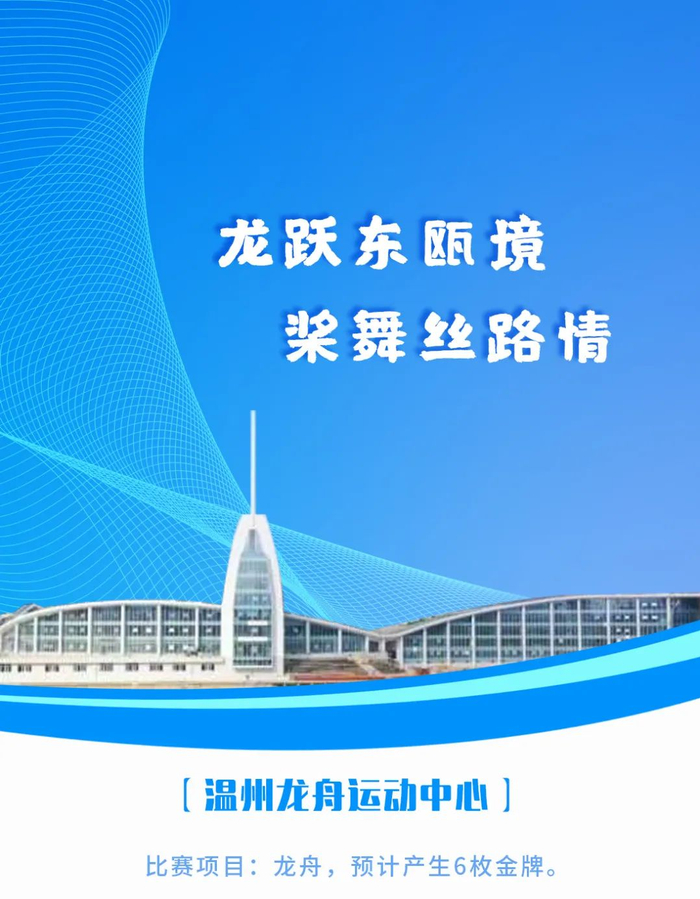 以“龙跃东瓯境·桨舞丝路情”为设计理念,采取"水岸同建、无缝相连"方式,布局"一场二馆一水上基地",是全国乃至全亚洲最高端、最标准的龙舟体育运动综合体。远远望去蜿蜒起伏,主楼依河而建,似蛟龙跃入水中;紧挨主楼的舟塔,造型似直立的划桨龙舟。