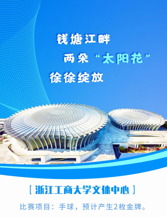 在浙江工商大学文体中心场馆基础上改造提升而成,建设之初选用“太阳花”的形状,是对运动、波浪元素的取向,体现了积极向阳的生活态度和对体育运动的热爱,更和校园文化“百舸争流”相呼应。在改造过程中物尽其用,共创共享绿色亚运。