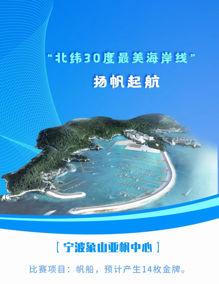 “一半在陆地,一半在海中。”亚帆中心是杭州亚运会唯一一个需要在海上施工的项目。分为比赛训练中心、水上运动基地、亚运村及港池四大板块,夜幕降临,亮起灯光,以“活力海洋”为主题的夜景泛光照明成为亚运特色的象山夜景新地标。