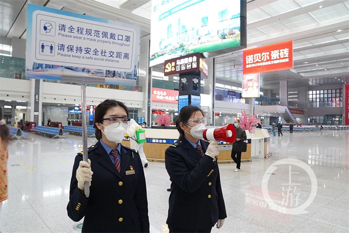 此外,重庆火车站执行3个100%措施,即对进出站旅客、职工严格落实100%体温检测、旅客100%健康码绿码通行、所有人员100%佩戴口罩的措施。每天上班前,工作人员均需进行体温健康监测,确保体温正常后才能上岗。
