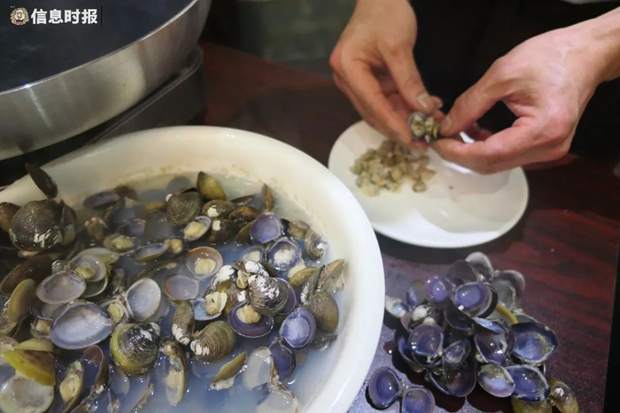 “生拆蚬肉生菜包”以时令荞菜和黄沙蚬肉为馅,冷“皮”(生菜)热馅包着吃,惹味不失清爽。信息时报记者 徐敏 摄