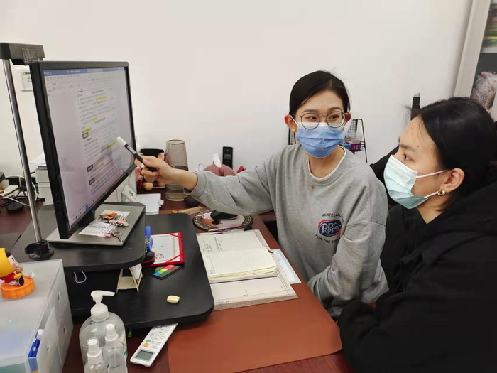 2022年3月29日,东北大学的辅导员(左)帮助大学生修改完善简历。新华社发