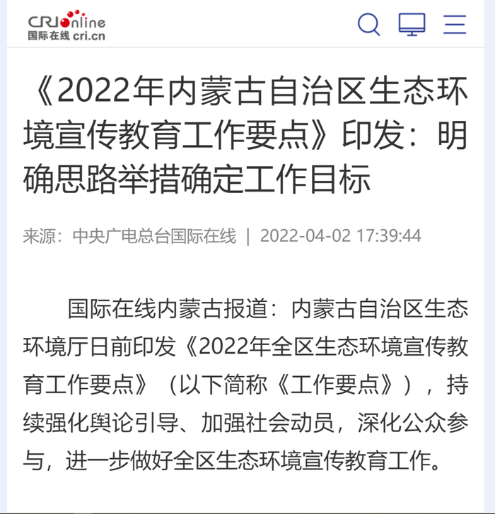 【媒体链接】《2022年内蒙古自治区生态环境宣传教育工作要点》印发:明确思路举措确定工作目标