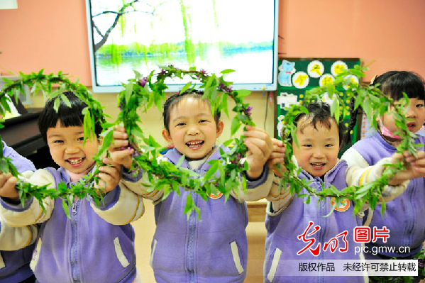 清明前夕,小朋友展示自己编制的柳条帽。(邓龙华摄/光明图片)