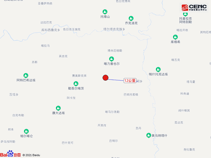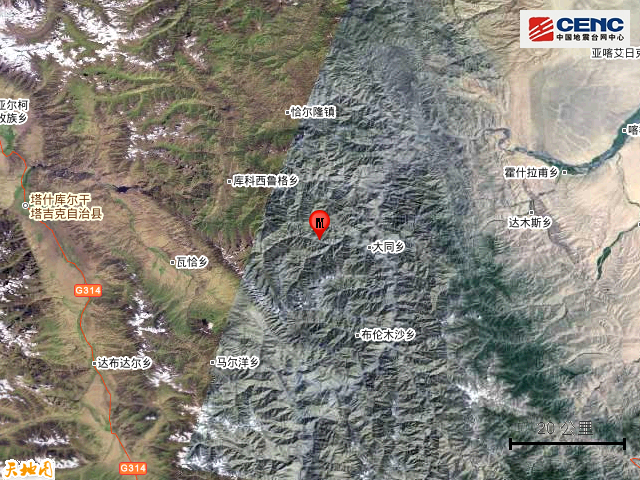 附近村镇:本次地震周边5公里内的村庄有阿达尔喀盆、提提克曼、曲万吉若普、阿克托尕兰干、若达勒孜、塔普普、祖勒瓦托格、哈五里克、巴库勒德、艾孜根迭,20公里内的乡镇有大同乡。