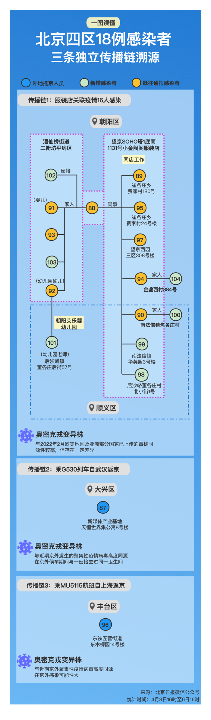 从4月3日开始,截至6日16时,已累计新增18名本土感染者,涉及朝阳、顺义、丰台、大兴四区,与北京此前的病例尚未发现关联性,据现有流行病学调查,可分为3条新的独立传播链。