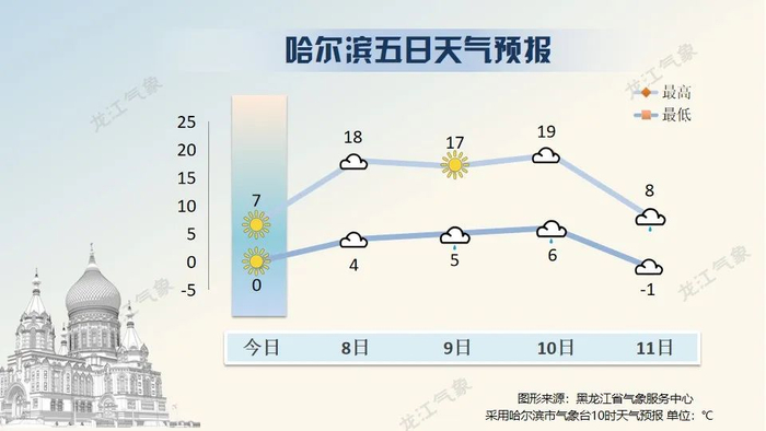 7日夜间最低气温:大兴安岭、黑河、伊春、鹤岗、佳木斯东部、鸡西-5~-3℃,齐齐哈尔、大庆0~2℃,其它地区-2~0℃。