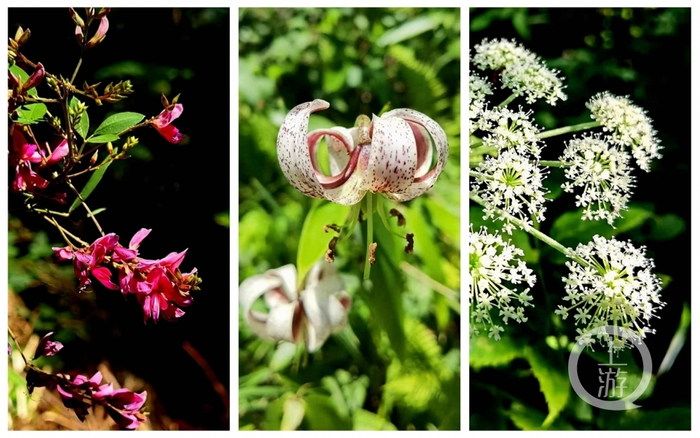 重庆五里坡国家级自然保护区内生态多样,植物丰富。(图中依次为胡枝子、宝兴百合、白芷)