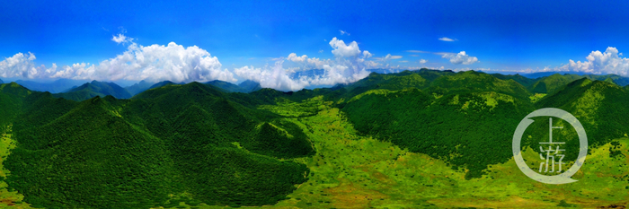 数千居民的搬离,让当地生态环境得到了改善。金丝猴在葱郁的林间嬉戏,娃娃鱼在清澈的溪水中畅游,原始森林、高山草甸、珍稀穗花杉群落,及各种野生动物欣欣然地自由生长。图为蓝天白云映衬下的五里坡显得格外迷人与神秘。
