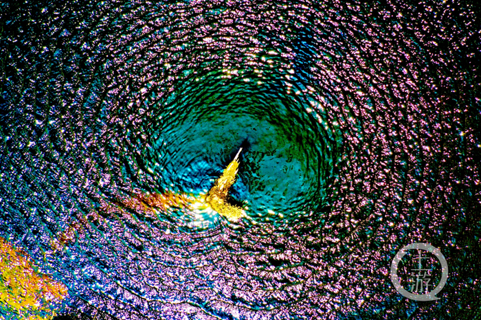 五里坡能成为世界自然遗产地,和重庆市巫山县一个“消失”的庙堂乡,有着千丝万缕的关联。图为五里坡天池在夕阳的映衬下,从空中俯瞰犹如大地调色盘,五彩斑斓。