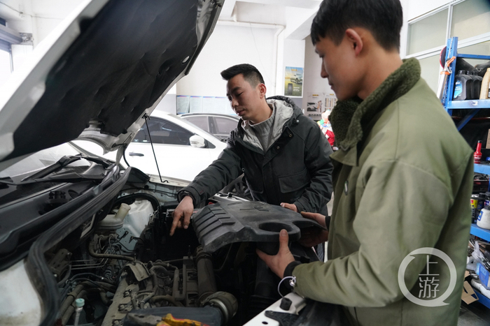 李斌在大昌镇开了一家汽修厂,在他的记忆中,父亲过去常年在外打工,妈妈在家种烤烟,要背着背篓走上一整天山路去临近乡镇集市售卖。“在山里面,只能勉强解决温饱。出来后,享受到搬迁补助等政策。我学了手艺,父母都在这里帮忙。一家人在一起,比什么都强!”李斌一家如今年收入50多万,最近添了新成员,三代人尽享天伦之乐。图为2022年3月,李斌(左)在车行工作。