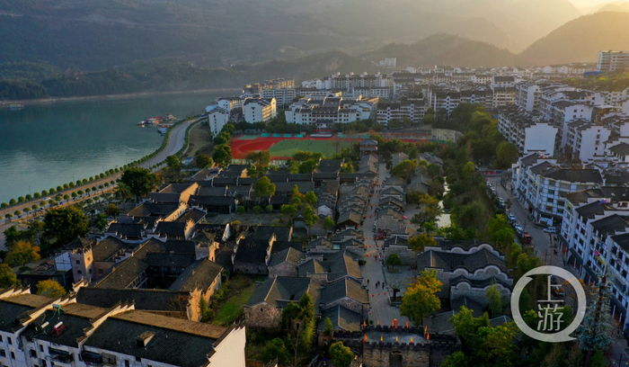 庙堂整乡生态搬迁,搬出了一个世界自然遗产地,搬出一条乡村振兴之路,搬来了绿水青山和人民的幸福笑颜。图为日落下的大昌古镇,再现千年古镇昔日繁华与沧桑。