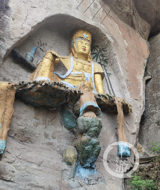 这个佛头处于几根大型排水管之间,要想近距离观看并不容易,必须穿过一段架在排水管上的简陋栈道才能到达,记者小心翼翼扶着岩壁才顺利通过,由于道路狭窄很不安全,因此这个佛头并不适合作为景点进行观赏。上游新闻记者也提醒大家,不要冒险前去打卡。