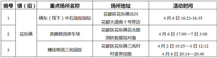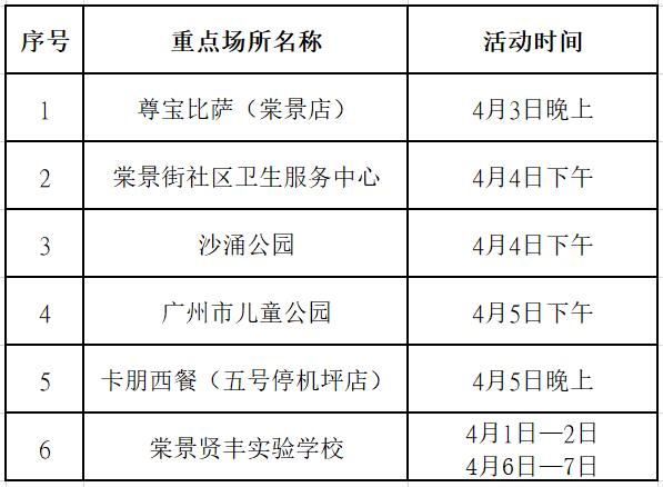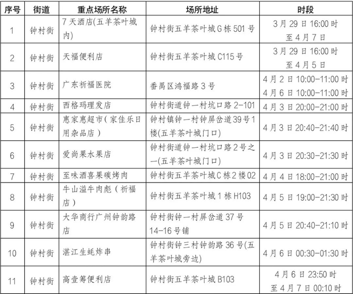 目前初步甄别花都重点场所3个(详见附表)。因疫情防控需要,请在风险时间段去过相关重点场所的人员,立即向所在社区(村)联系报备,并前往就近核酸检测点进行核酸检测,同时配合社区(村)和疾控部门要求做好健康管理。