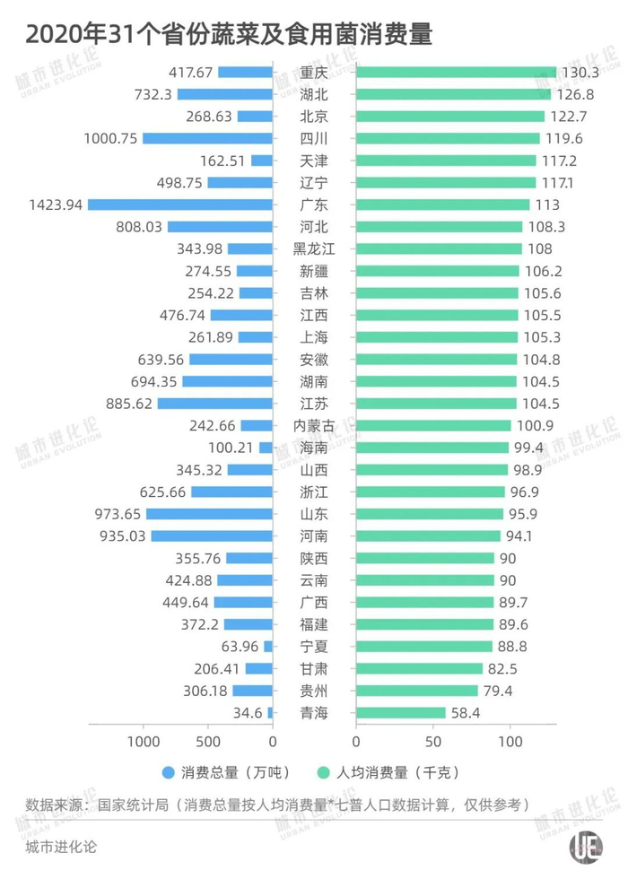 根据国家统计局2020年数据,重庆是全国人均蔬菜及食用菌消费量最多的省份,平均每人消费蔬菜达130.3千克,四川则以119.6千克居于第四,居于湖北、北京之后。而看总消费量,四川共消耗超1000万吨蔬菜,仅次于广东。