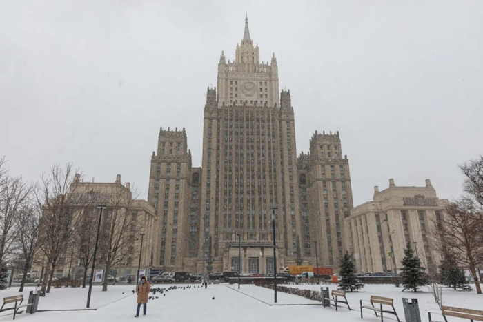 3月28日,在俄罗斯首都莫斯科,行人从俄罗斯外交部大楼附近走过。新华社记者白雪骐摄