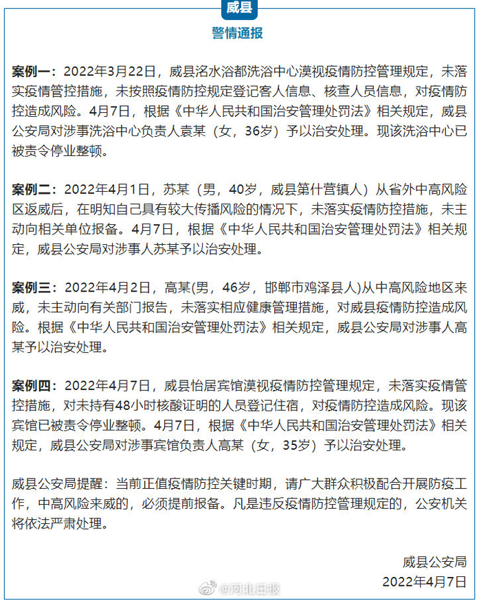 案例二:2022年4月1日,苏某(男,40岁,威县第什营镇人)从省外中高风险区返威后,在明知自己具有较大传播风险的情况下,未落实疫情防控措施,未主动向相关单位报备。4月7日,根据《中华人民共和国治安管理处罚法》相关规定,威县公安局对涉事人苏某予以治安处理。