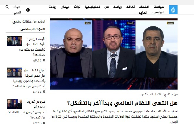 2月4日,中俄发表联合声明,号称“中东CNN”的半岛电视台将之定性为历史性的事件,该台最善于抓热点的金牌吵架节目《针锋相对》立刻推出一期《大冲突——是美国之星暗淡而由中国和俄罗斯联手统治世界了吗?》。