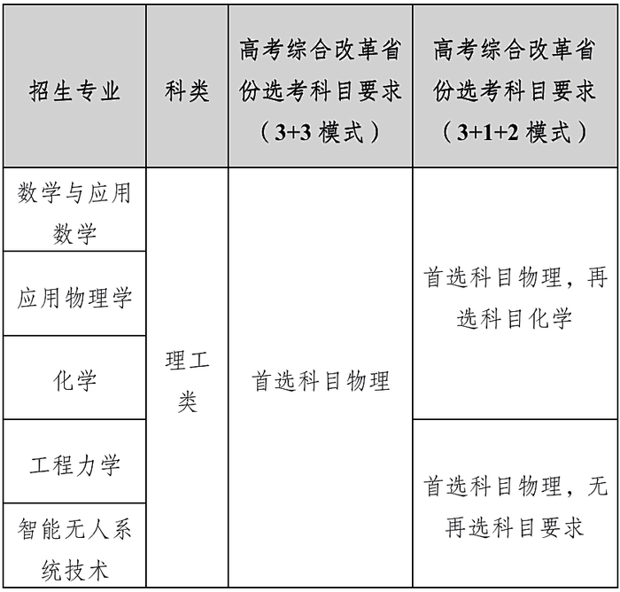 学校强基计划招生专业为数学与应用数学、信息与计算科学、应用物理学、化学、工程力学、飞行器动力工程。