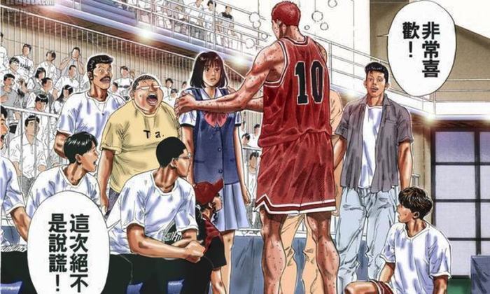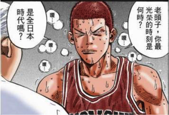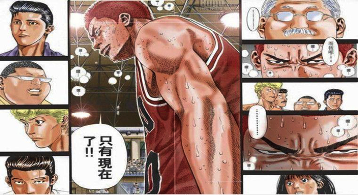 本作主角樱木花道在背部受到可能影响运动生涯的致命伤后,仍然坚持上场,并对暗恋了一整部漫画的赤木晴子说出那句“非常喜欢(打篮球)!”以及对安西教练说的那句“老爹,你最光荣的是什么时候?而我呢,只有现在了!”绝对是动漫史上堪比孙悟空在那美克星领悟超级赛亚人变身的超燃场面啊。