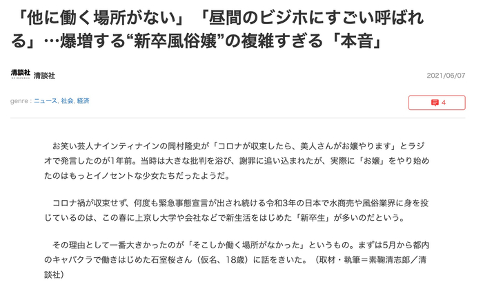 日本《儿童色情禁止法》严格规定未成年人不允许拍摄AV,背后的事实是成年女性因为主观或者客观的原因不得不入行,甚至有被迫/被骗进入这个行业的情况。由于新冠疫情造成劳动力需求减少,从2021年开始就有很多日本女大学生失去了普通的打工收入,不得不辗转于各类夜总会。