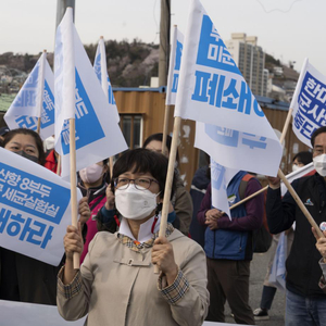 2022年4月5日,韩国民间团体和大学生在韩国釜山的美军基地附近示威抗议,呼吁停止韩美联合军事演习,要求关闭釜山港美军基地内的生物实验设施。李相浩摄