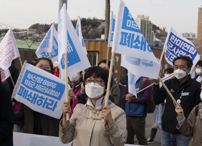 2022年4月5日,韩国民间团体在位于韩国釜山的美军基地附近游行示威,呼吁停止韩美联合军事演习,要求关闭釜山港美军基地内的生物实验设施。李相浩摄