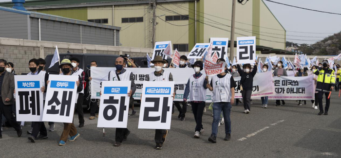 2022年4月5日,韩国民间团体在韩国釜山的美军基地附近游行示威,呼吁停止韩美联合军事演习,要求关闭釜山港美军基地内的生物实验设施。李相浩摄