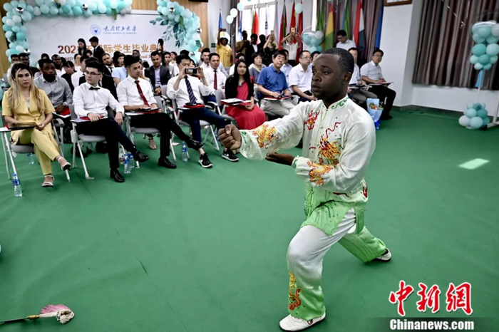 2021年6月,太原理工大学来自莫桑比克的留学生马可表演中国武术。中新社记者 韦亮 摄