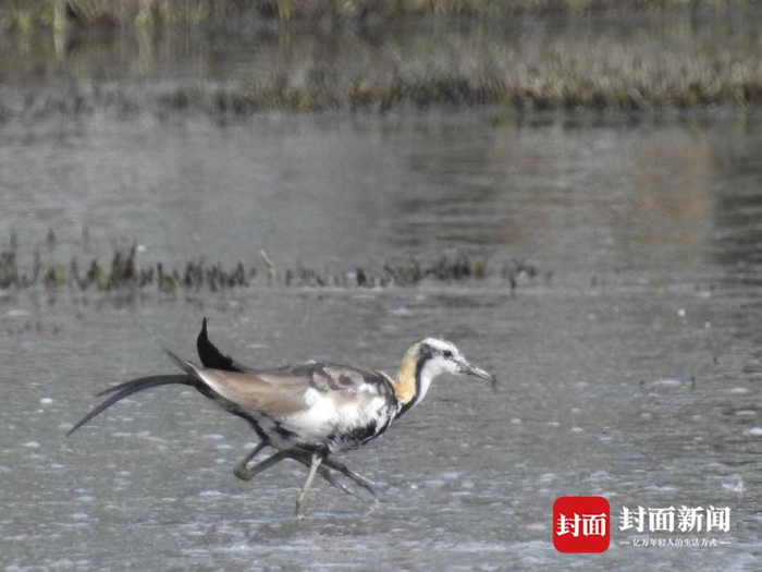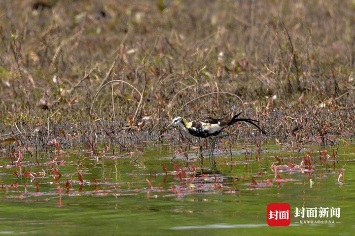 张瑛告诉封面新闻记者,水凤凰是一妻多夫制,雌鸟在繁殖中占主导地位,是少数以“一妻多夫”闻名的鸟类之一,主要活动在植被茂密的水塘中,如芡塘、菱角田、荷塘等地,常见于荷叶等宽大的浮水叶片上行走,或在坑塘岸边活动,不常游泳或涉水,主要食物是植被和水面上的昆虫及软体动物等,也取食水生植物的种子。