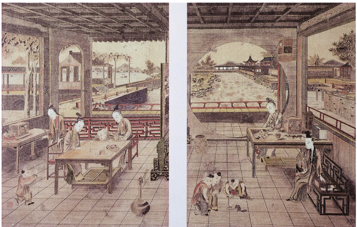 据高居翰在《致用与娱情》一书中介绍,实际世俗绘画一类作品在中国绘画发展的最早阶段就已出现,宋代偶有名作问世,但大规模且多样化的创作集中在17世纪末至18世纪。明代末期,中国社会逐渐从以农为本的社会中发展出早期城市化与商业化的雏形。生活富足的商人群体也渴望体验昔日为文人士绅、朝廷官吏所独享的文雅生活,这构成推动城市画坊画师快速兴起的市场推力。加之雕版印刷技艺日渐成熟,为城市印刷文化的规模化提供技术支撑。这些都使得明末之后的盛清(主要指“康雍乾盛世”)成为应雇主要求而作的世俗画发育的沃土。