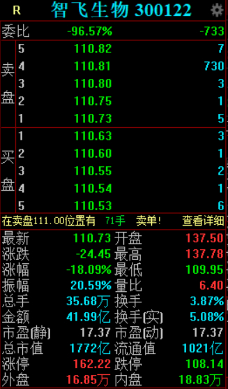 近日,WHO称HPV疫苗单剂接种即可预防宫颈癌。4月14日,智飞生物盘中跳水。截至发稿,跌超18%,成交额超41亿元。