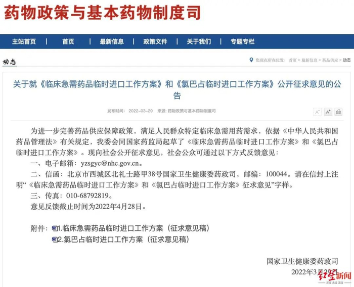 今年3月29日,国家卫健委发布《氯巴占临时进口工作方案》公开征求意见的公告,“为满足氯巴占临床用药急需,根据《临床急需药品临时进口工作方案》有关规定,制定氯巴占临时进口工作方案。”