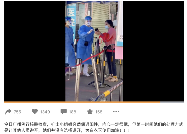 一则“护士例行核酸检查偶遇一例阳性”的视频在网上流传。视频显示,白云区妇幼保健院一位护士查看市民手机发现阳性,不断提醒后边排队的群众保持距离。4月10日,记者证实,实为病人把黄码误作阳性。