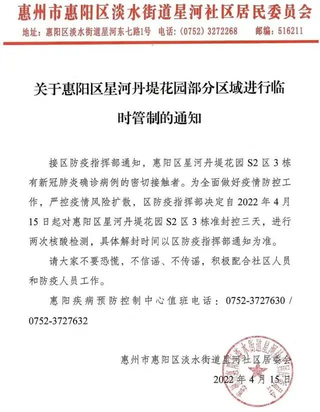 4月15日,惠州市惠阳区淡水街道星河社区居委会发出《关于惠阳区星河丹堤花园部分区域进行临时管制的通知》称,接区防疫指挥部通知,惠阳区星河丹堤花园S2区3栋有新冠肺炎确诊病例的密切接触者。为全面做好疫情防控工作,严控疫情风险扩散,区防疫指挥部决定自2022年4月15日起对惠阳区星河丹堤花园S2区3栋准封控三天,进行两次核酸检测,具体解封时间以区防疫指挥部通知为准。