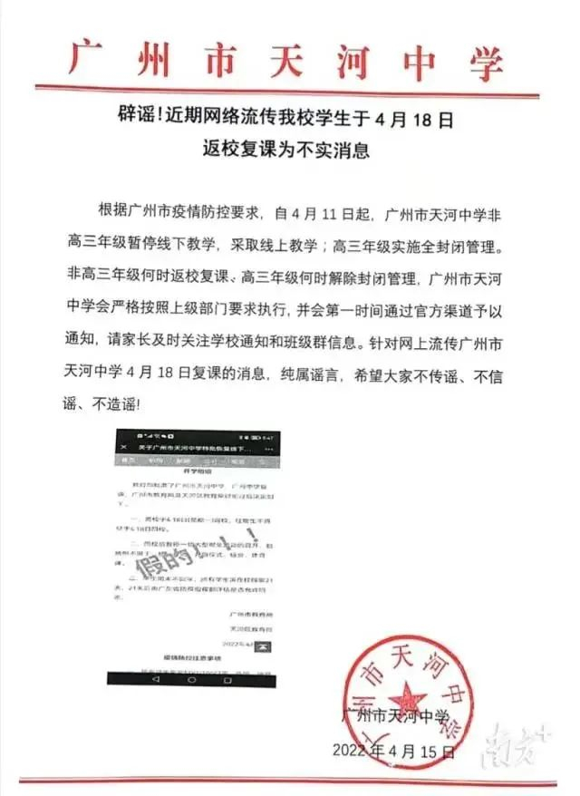 4月15日,广州中学、天河中学发布消息,18日复课为不实消息。根据广州市疫情防控要求,自4月11日起,广州中学非高三年级暂停线下教学,采取线上教学;高三年级实施全封闭管理。