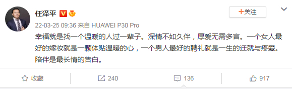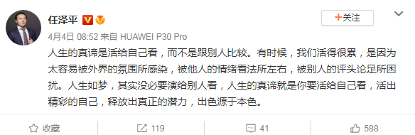 如在“泽平宏观”公众号上,任泽平多次发文关于“幸福”“婚姻”“人生”的感悟。4月10日,他发布了《和谁在一起,的确很重要》一文,讲述的是“余生不长,和不一样的人在一起,就会有不一样的人生。和优秀的人同行,能帮助你遇见更好的自己。”该文有10万+的阅读。