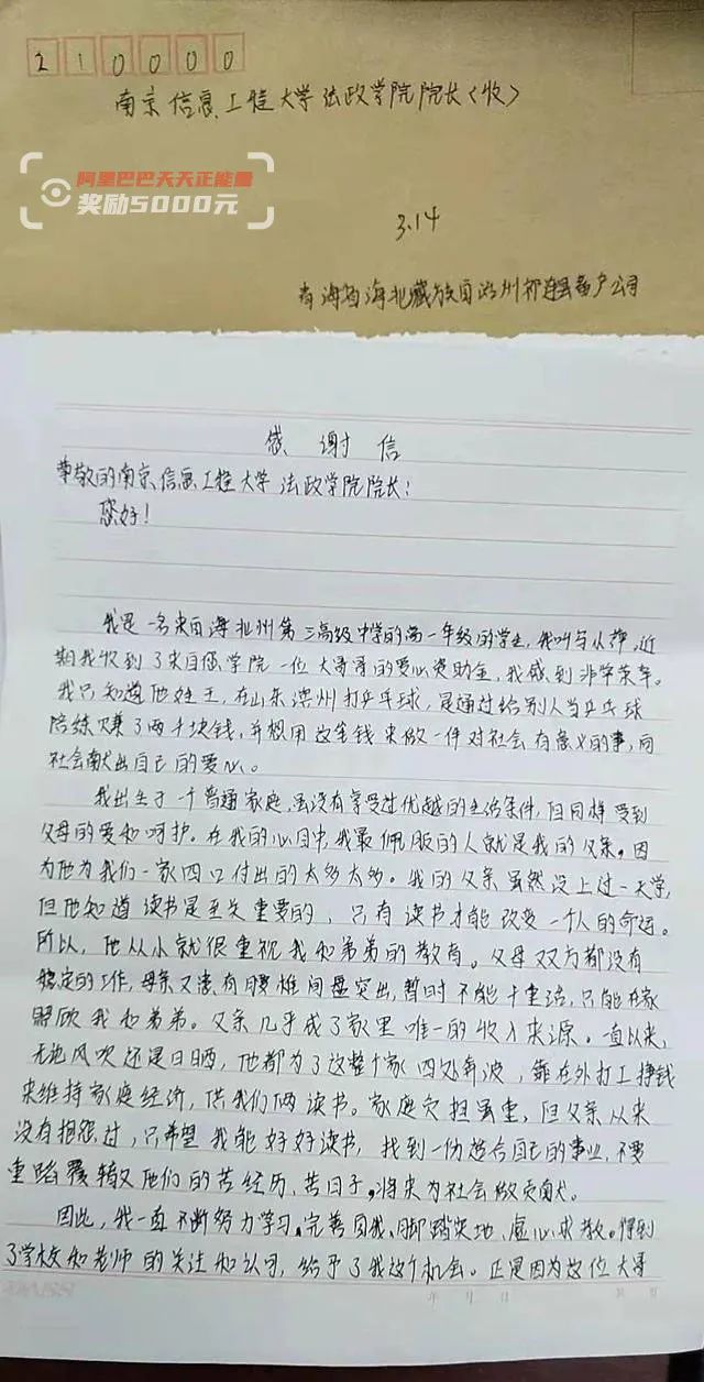 “哥哥的爱心资助,让我的生活得到了改善,减轻了家中的一部分支出,更给予了我精神上的鼓励和支持。一瞬间,心中燃起了新的希望之火,对未来的美好愿景化为一股强大的动力支撑着我的信念,助力我前进。”