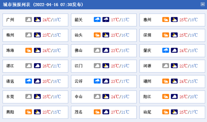 16日,韶关、清远、肇庆北部市县多云到阴天,局部有阵雨,其余市县多云。早晨最低气温:粤北的北部市县13~16℃,南部市县20~21℃,其余大部分市县17~20℃。