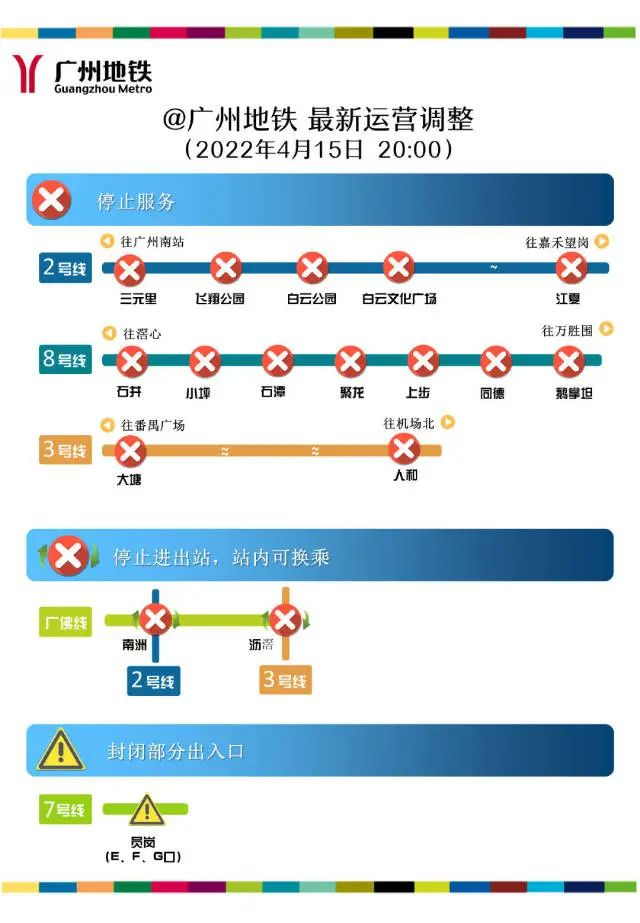 自2022年4月15日20:00起,广州地铁八号线鹅掌坦、同德站停止对外服务。截至目前,广州地铁共16个站点停止对外服务。