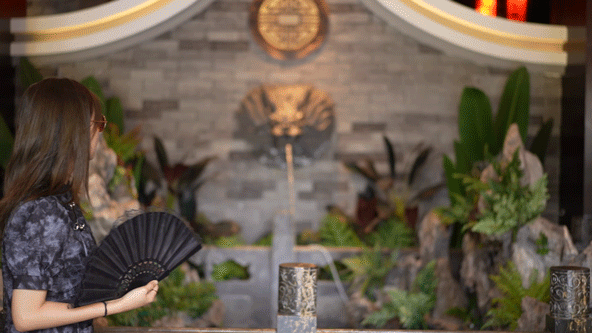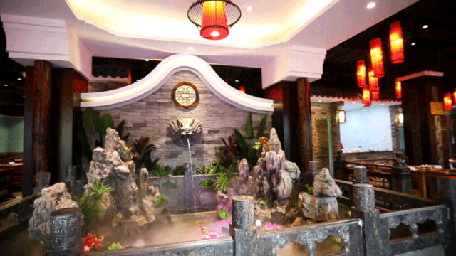 大龙燚依旧沿袭着成都风格装修,进门就能看到非常惹眼壮观的亭台假山,仿佛旧时书香门第里的后院。