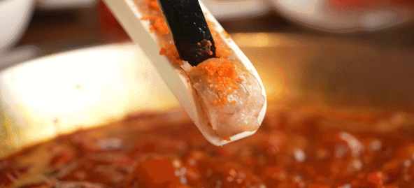 大龙燚的「双色虾滑」,选用了18只广西北海南美白虾,经过上千次手工捶打,还能明显看见大颗的虾肉粒噢~
